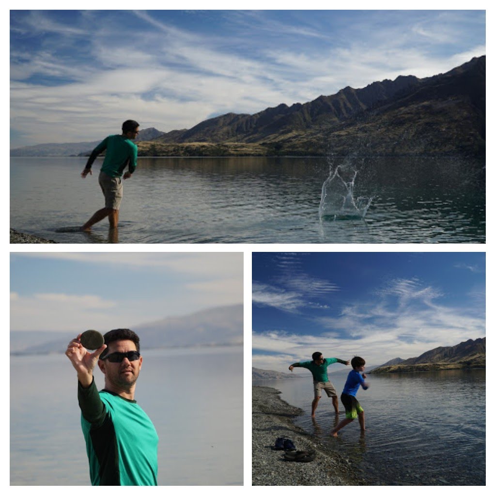 We carried on to wonderful campground on Lake Hawea (after a brief stop at the Blue Pools), just before the town of Wanaka (emphasis on the first syllable). This happened to be the best rock skipping lake on the planet. No joke. It was as though a team of stone masons had spent the better part of a millennia hand crafting an entire beach of perfectly round and flat stones right up against a placid lake. The boys (I'm a boy too) spent several hours hucking stones in that lake.